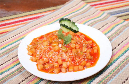 主料:猪肉100g、土豆200g、胡萝卜150g、蒜苔50g、黄瓜30g、大米一杯